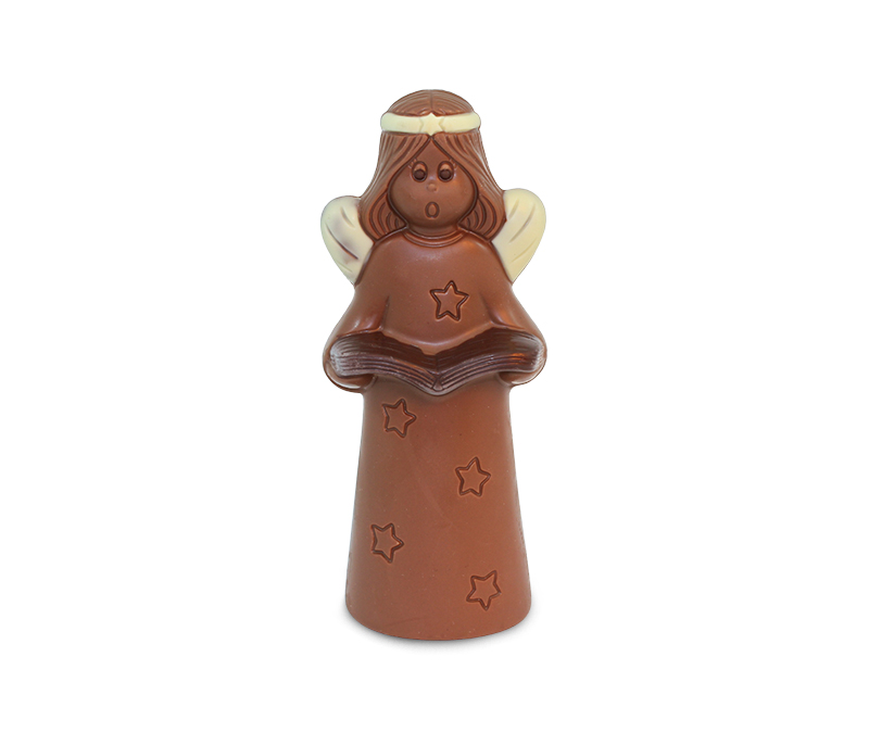 Engel singend aus edler Vollmilchschokolade dekoriert mit weißer und Zartbitterschokolade
