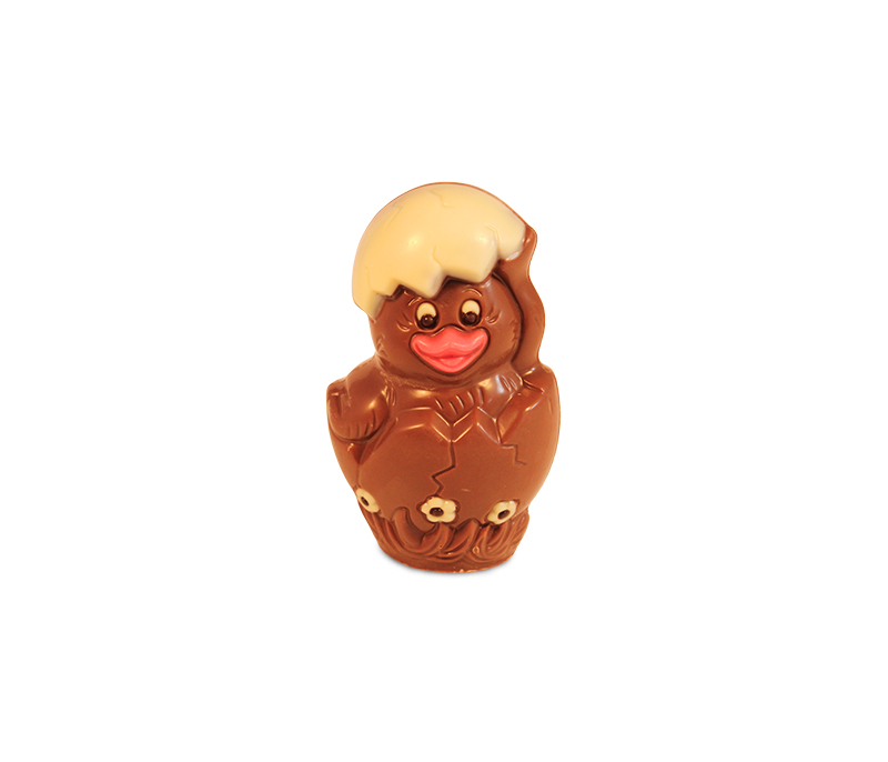 Küken mit Ei aus edler Vollmilchschokolade dekoriert mit weißer und Zartbitterschokolade