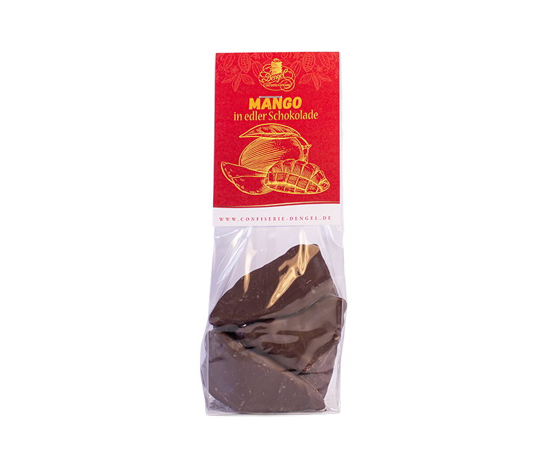 Getrocknete Mangostreifen überzogen mit edler Vollmilch- oder Zartbitterschokolade