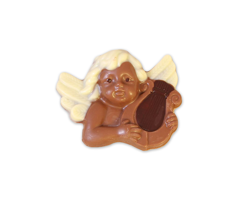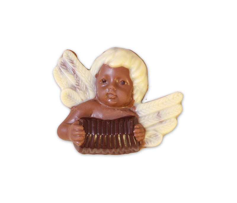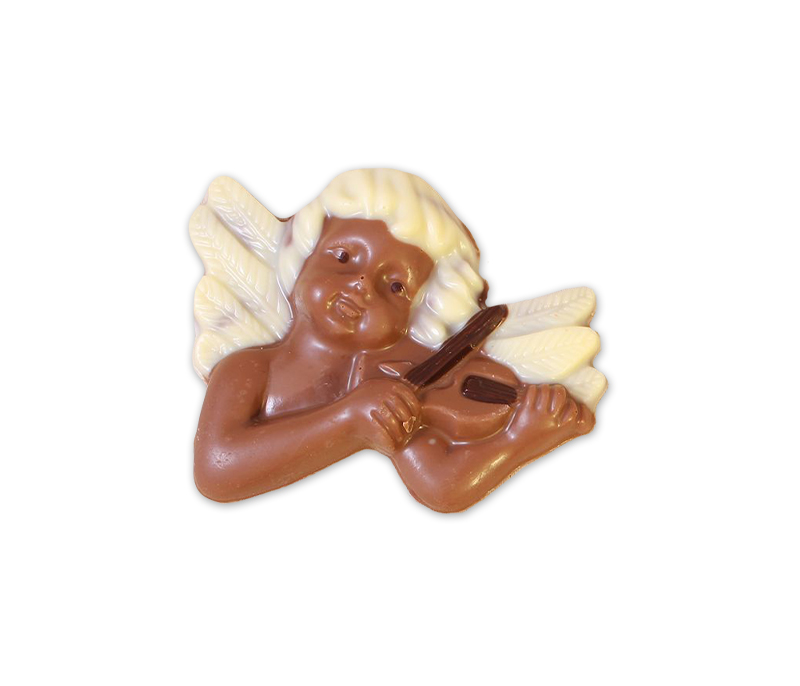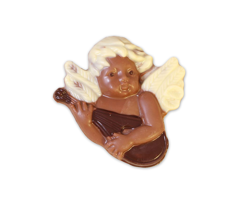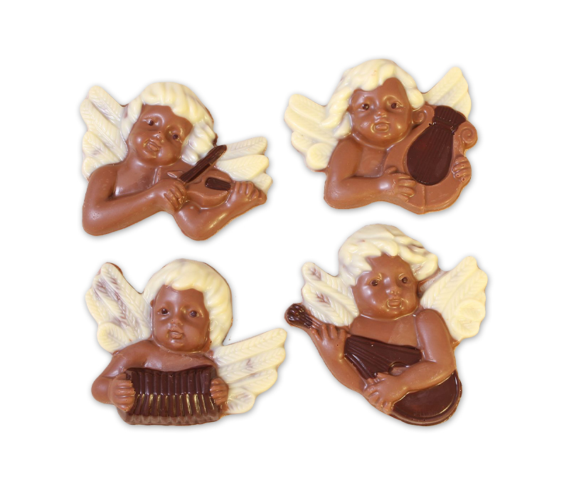 Weihnachtrelief musizierende Engel aus edler Vollmilchschokolade, dekoriert mit weißer und Zartbitterschokolade.